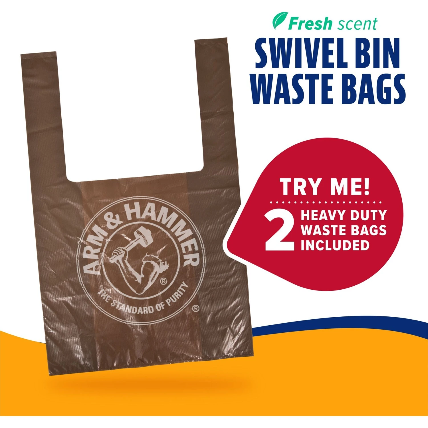 - Two bonus waste bags included that are infused with activated baking soda to neutralize odors and leave a fresh scent. Compatible with Arm & Hammer heavy duty waste bags.