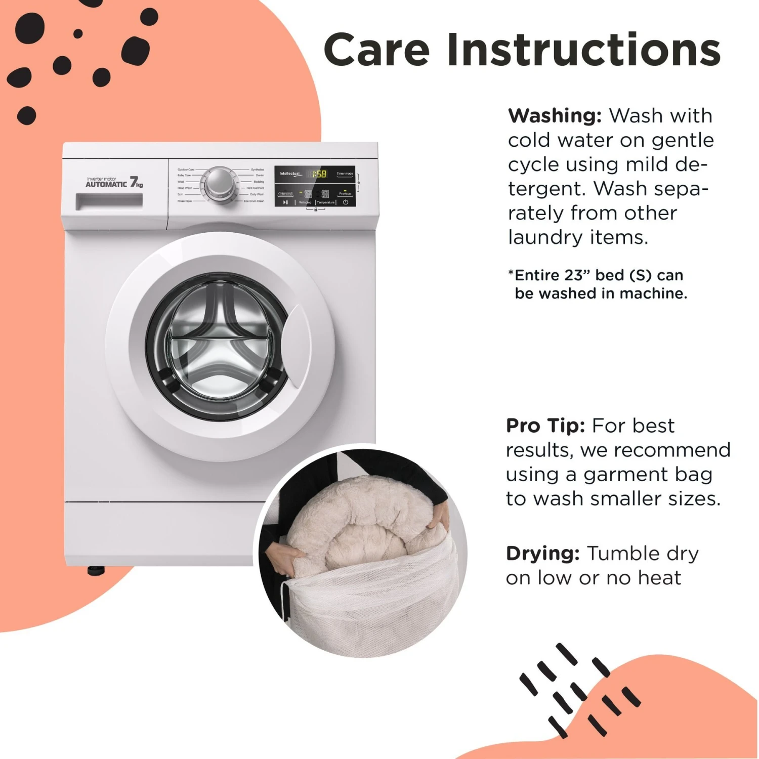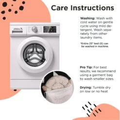 - Machine wash the entire bed on gentle cycle and dry on low or no heat; see pro tips for more details.