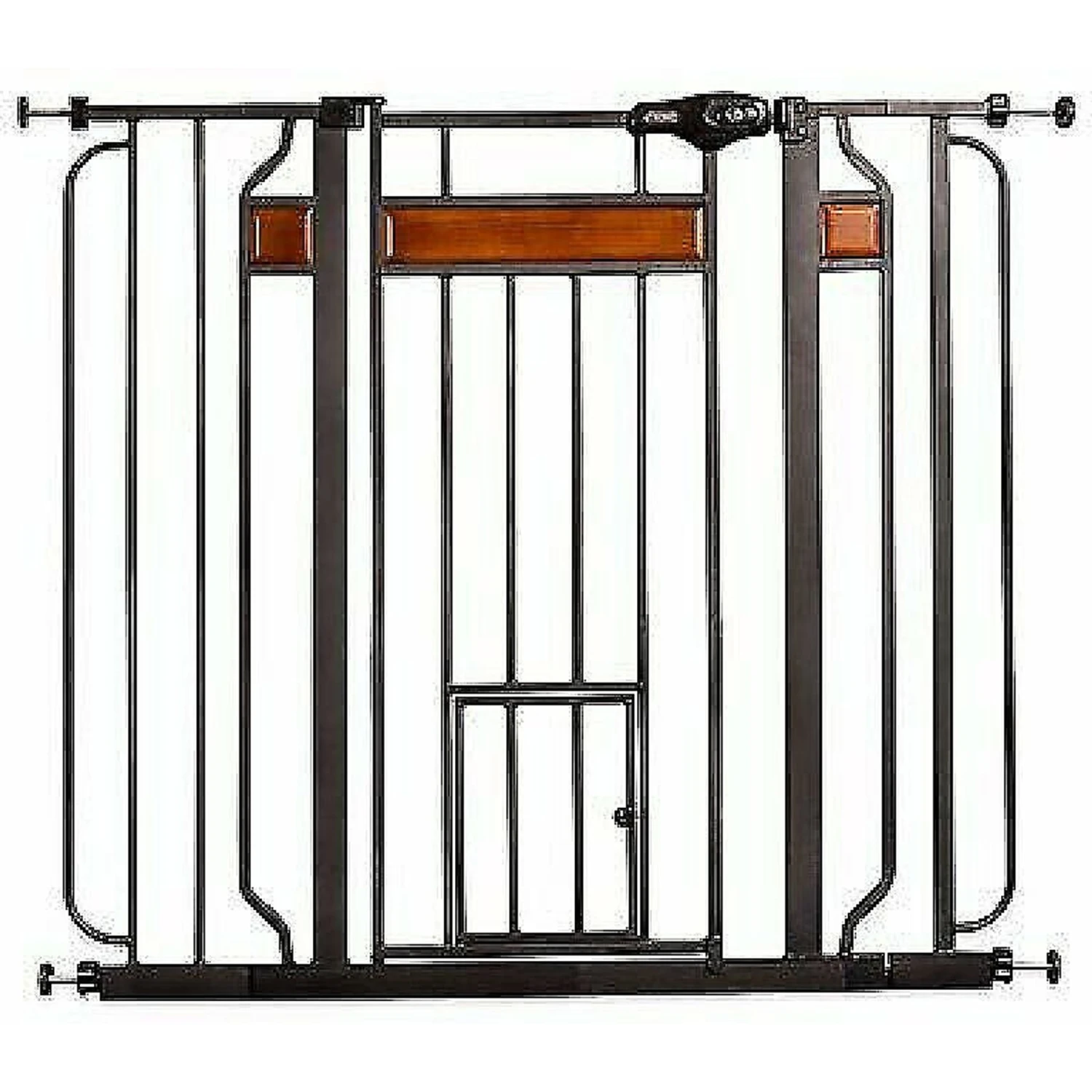 Keep big dawgs and high-jumping puppers safely contained with the Carlson Pet Products Design Paw Extra Tall Pet Gate, Black. This stylish gate features all-steel construction with cherry wood accents in an extra-tall 37 inch height. The expandable gate installs easily with pressure mounts in any opening 30-42 inches wide. It features an easy-open slide handle that locks automatically when shut, with an 8 X 8-inch door that lets small pets pass through easily.