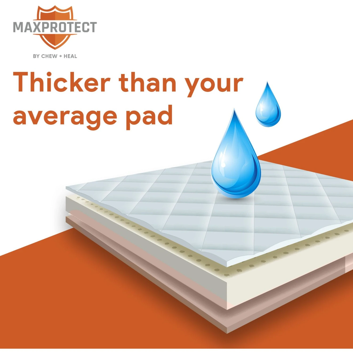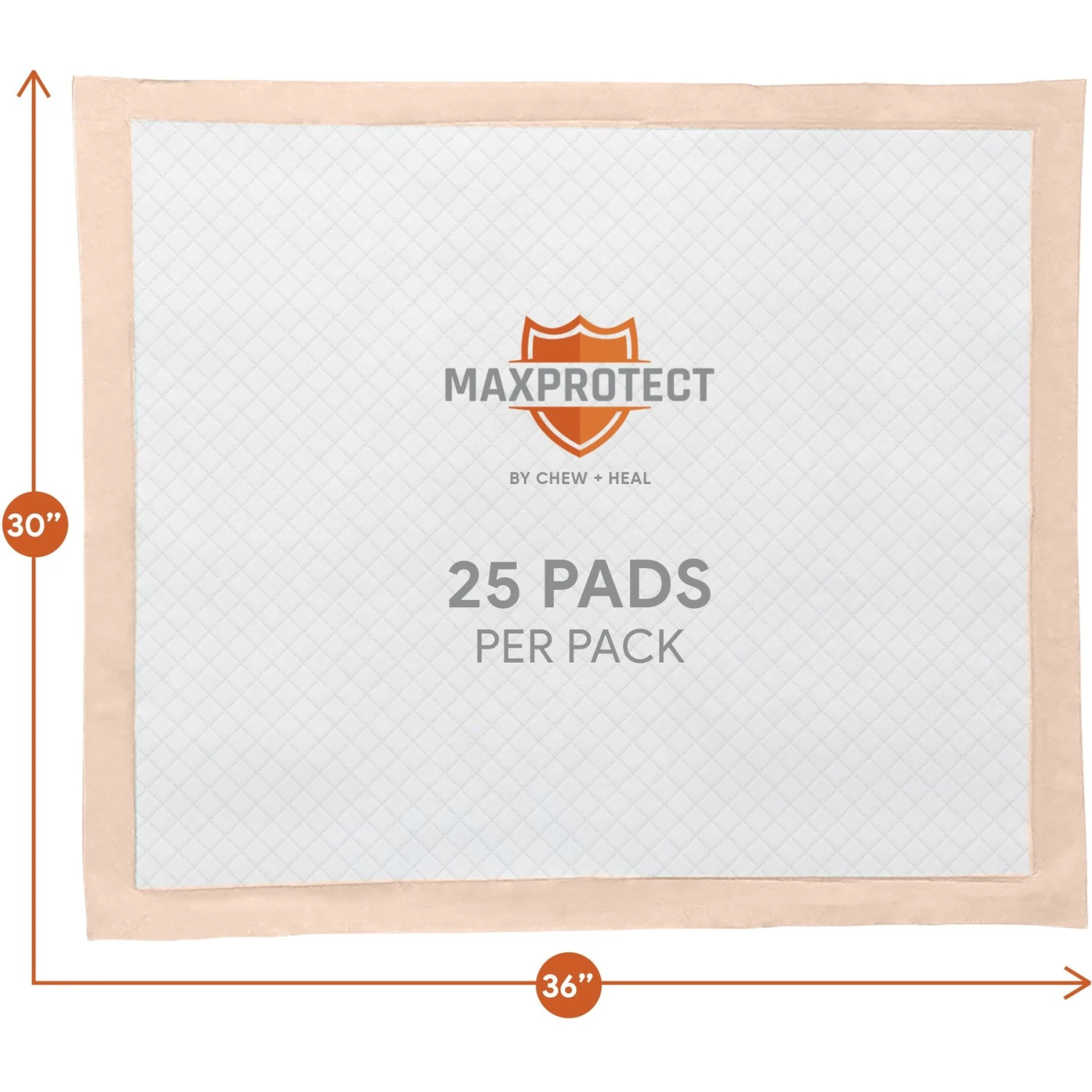 The Chew + Heal Max Protect Ultra Absorbent Dog Potty Pads are paw-some for potty training your pup! These heavy-duty pee pads have a su-paw high absorbency. They’re crafted with three hefty layers to help keep your floor or car clean, even if your furbaby soaks through some weaker pads. Ideal for potty training puppies or seniors who can’t always make it outside in time, these pads lock in wetness. They feature a waterproof backing and are designed to stay firm, even when they’re wet.