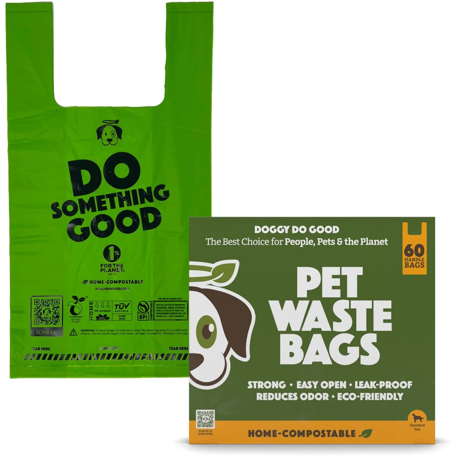 Pick up after your furry friend with Doggy Do Good Certified Compostable Premium Dog & Cat Waste Bags- Handle Bags! These scent-free, tear-free, leak-proof waste bags are big, thick (20 microns thick) and tough, keeping the contents and unpleasant odors inside the bag where they belong. They are 38% vegetable based and made from corn starch, an annually renewable source, along with other bio-based proprietary components. And since they are scent-free they won’t bother pet parents who are sensitive to fragrances! Not only are they great for cleaning up after your canine or feline, but these 7 in x 13.4 in waste bags can also be used to clean out litter boxes or for disposing eco-friendly baby diapers. The gusseted side panels expand for maximum capacity! These bags are packaged in a box that’s made from recycled materials, which doubles as the paw-fect dispenser. The handled bags dispense from the back opening of the box, which fits nicely on a bookshelf or even in the back pocket of a car seat—keep a box wherever you and your pet may go, so you’re always prepared! And you can feel extra good knowing that Doggy Do Good does good for the environment because they are part of a group of organizations that pledge a minimum of 1% of annual sales to environmental causes. Doggy Do Good donates an additional portion of proceeds to rescues and animal welfare organizations, too!