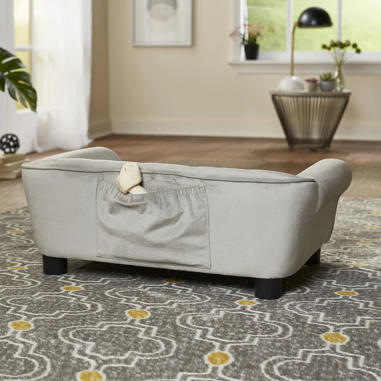 Your pup or kitten will enjoy a nice lay about on the classically styled Enchanted Home Pet Charlotte Sofa Cat & Dog Bed with Removable Cover. This pet bed has a calm, neutral tone with ultra-plush grey cushions and rolled arms, which are great to snuggle up against.