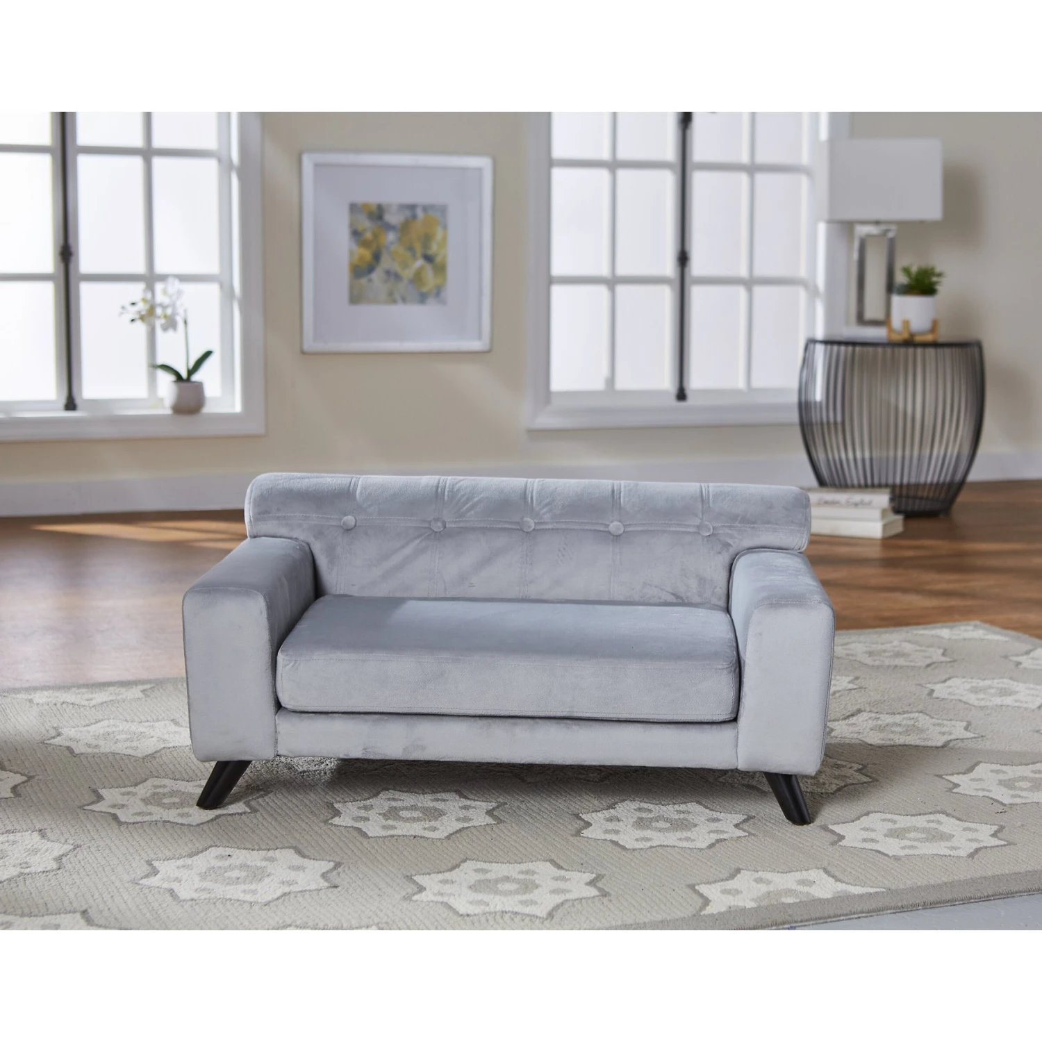 Give your sweet pupper a couch of her own with the Enchanted Home Pet Mason Sofa Dog Bed. This pretty grey lounger is velvety plush, with a soft lofty cushion and supportive padded sides. With its clean, modern lines and slanted wood legs, this sofa has design cred for days! A big roomy pocket lets you store toys out of sight, while the cushion cover comes off for easy washing. Designed with furniture-grade construction and vibration resistant legs, this sturdy bed supports pets up to 30 pounds in dreamy style!