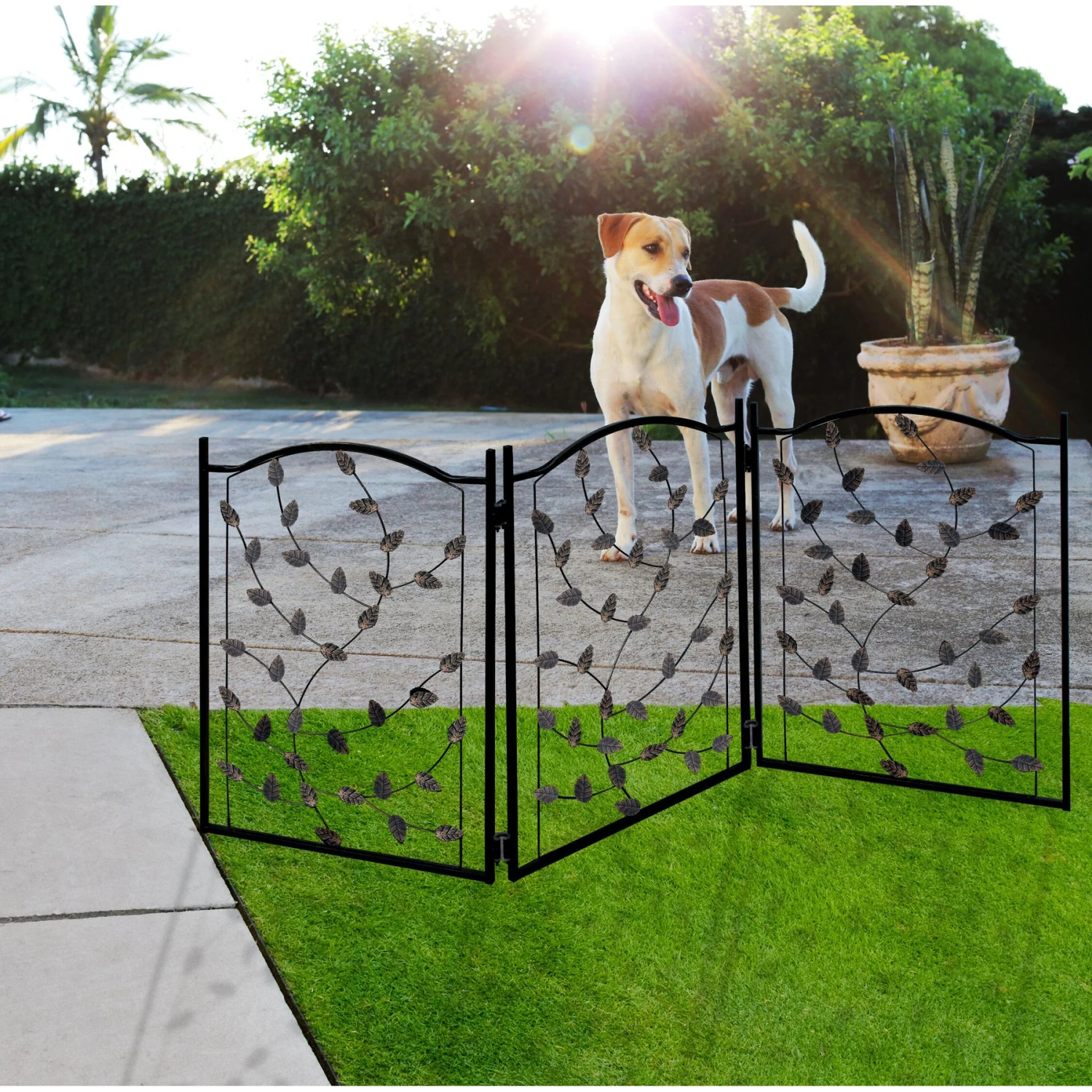 Bring an eye-catching touch of nature into your home with the Etna 3 Panel Leaf Design Adjustable Metal Pet Gate. This metal tri-fold gate is nothing like your traditional utilitarian pet gates. Instead, its arched panels and branching vines of leaves create an elegant addition to your home. It’s lightweight and folds up, so it’s easy to store away. There’s no installation required, thanks to its paw-some freestanding design—move it around your home as needed. With a total unfolded length of 53 inches, this gate can close off doorways, stairs and other off-limits areas to help keep your best friend safe. Have outdoor fun planned? Bring this gate out on your porch or deck to keep your furbaby safe and contained.