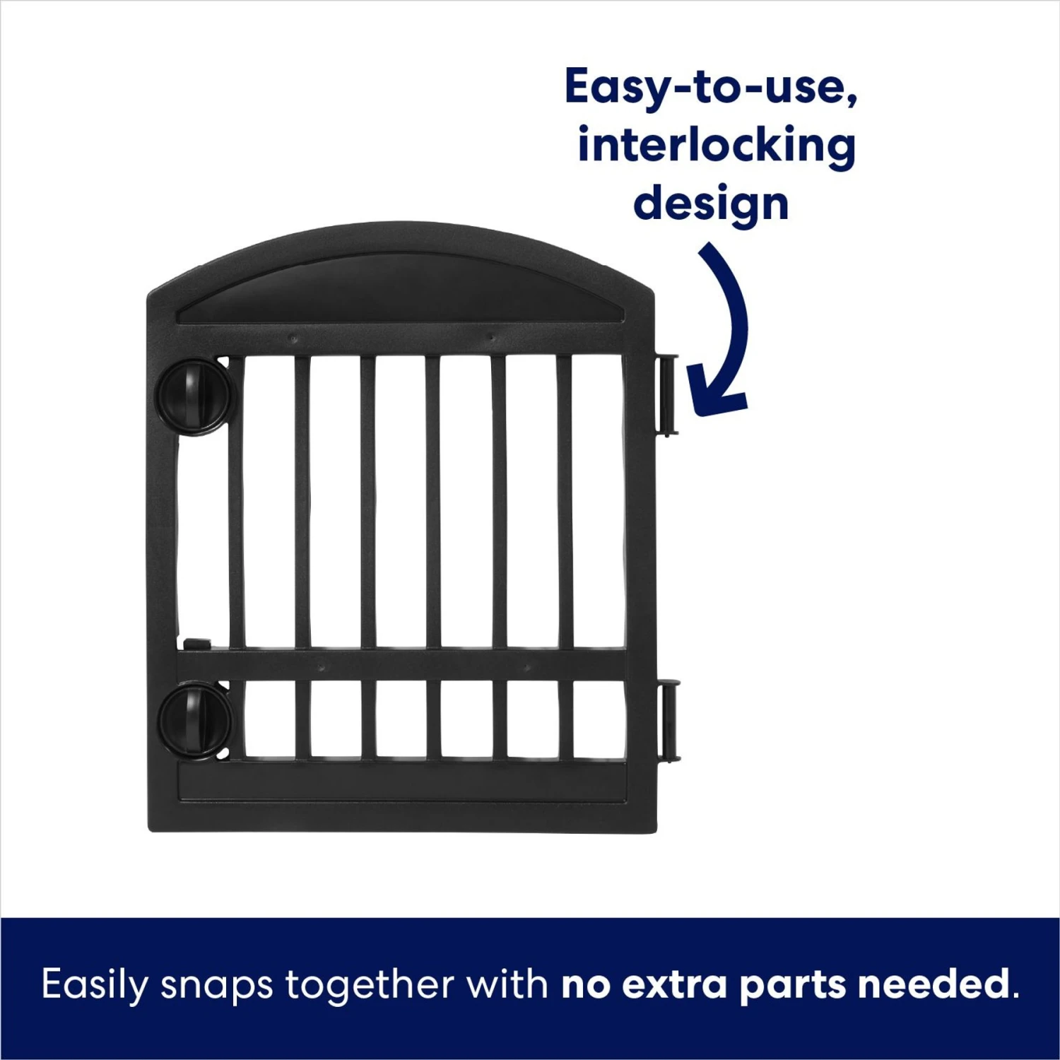 Give your furry friend a safe and secure place to play and lounge with a spacious pen from Frisco! This exercise pen safely keeps your pet enclosed in any indoor area you choose, so they can stretch out in the eight square feet of play space while you relax knowing your best pal is comfortable and out of trouble. The four individual panels have an interlocking design that snaps together easily with no added parts, and the secure, double-latch door requires no extra assembly time. Just snap the panels together and relax! This pen has a configurable design, so you can adjust the shape of the enclosure to hold their food and water bowls, plenty of toys and even a comfy bed. Plus, to protect your floors from scratches and scuffs, the panels have non-skid rubber feet that keep the pen in place.