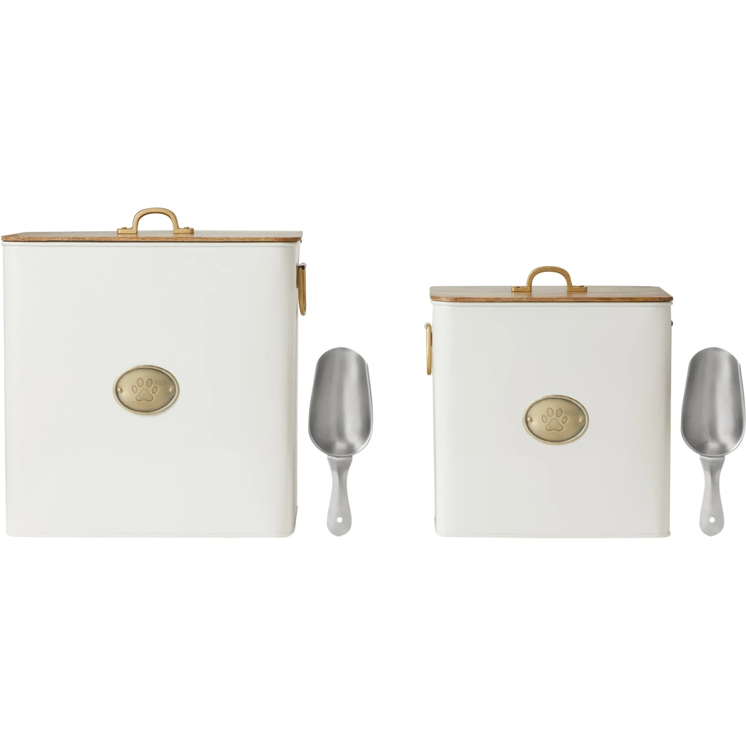 There’s more to your pet’s eating experience than just serving up some delicious meals on a platter—you also have to make sure their food is kept as fresh as possible! That’s where this Frisco Premium Paw Food Storage container comes to the petscue! The stainless-steel design makes it super durable, and the wooden lid keeps your pet’s food sealed from any unwanted guests out and their food nice and fresh. Comes with a scoop and is available in a 16-quart container and a 34-quart container. A minimal design to fit in nicely with any kitchen décor, from the pet experts at Chewy.
