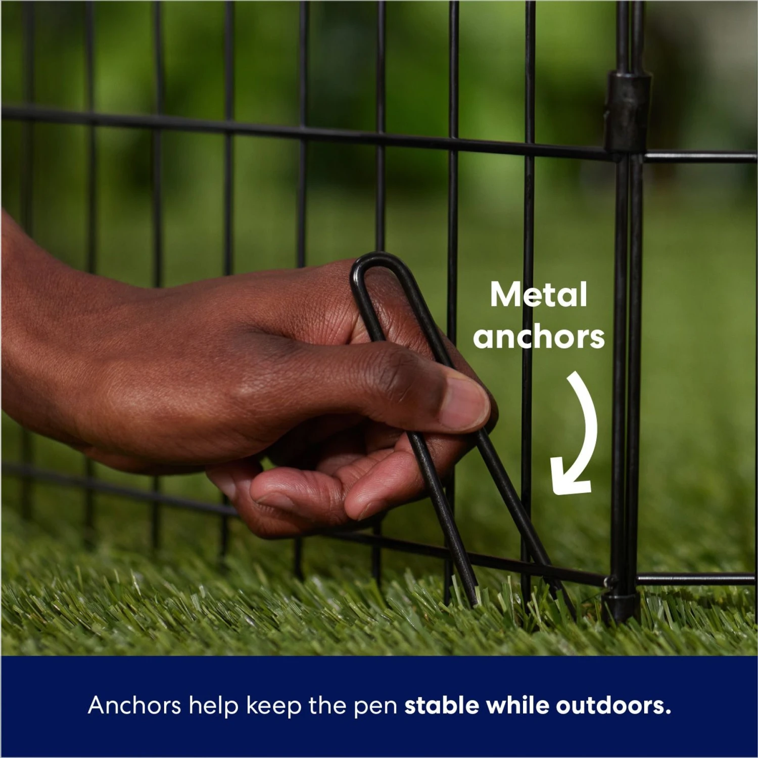 This Frisco by Chewy Wire Dog and Small Pet Exercise Pen with Step-through Door provides a safe and secure play area for dogs, cats and rabbits, whether indoors or outside. Constructed using sturdy metal wire coated in durable black e-coating, it’s made to last. The easy-access doorway securely latches closed with double locks and an additional safety clip. Metal anchors are included to keep the pen in place when used outdoors. The eight hinged panels can be configured into square, rectangle and octagon shapes, with plastic corner stabilizers included for the octagon configuration. And it conveniently folds flat for easy transport and storage.
