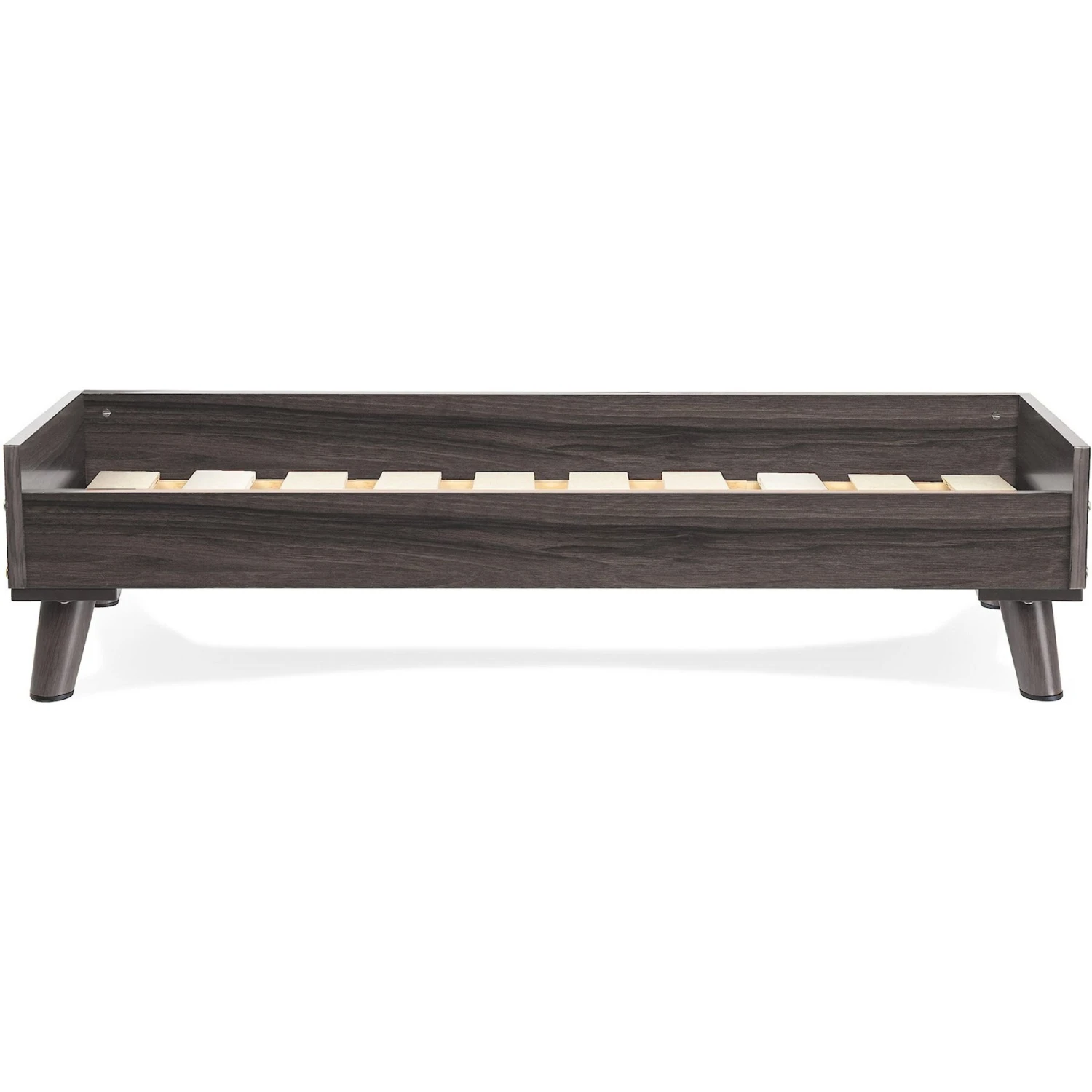 - Elevated bed frame with stylish wood-look veneer finishes.