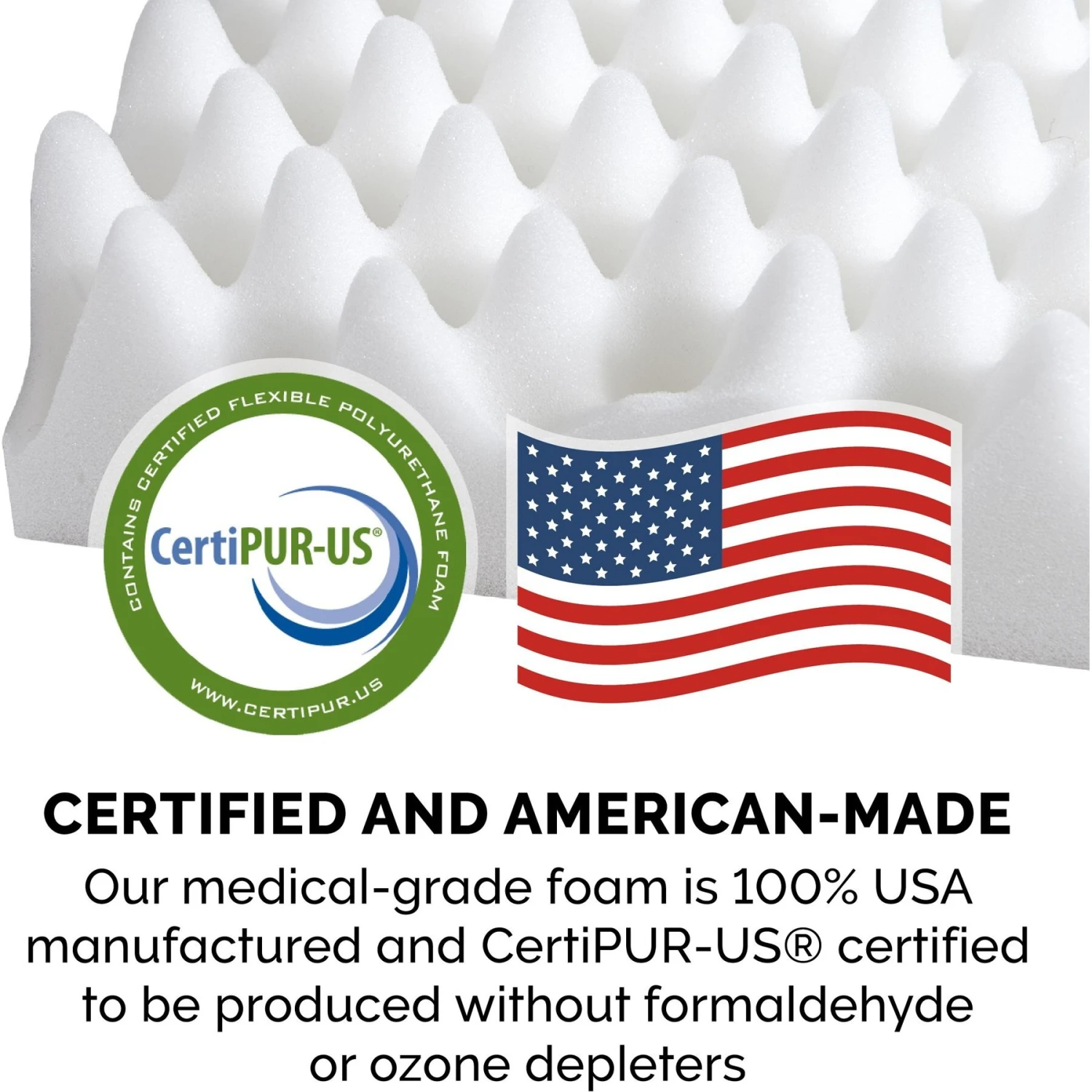 - Deep convolute “egg crate” foam evenly distributes weight and alleviates pressure on the muscles and joints.