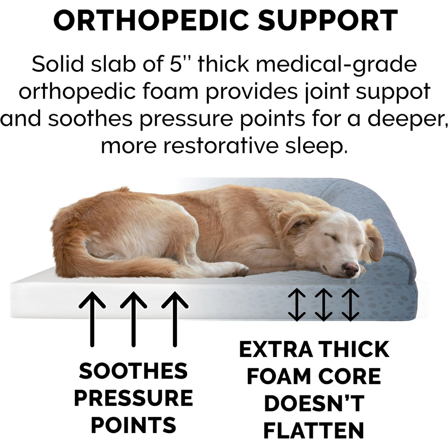 Pamper your pet with the FurHaven Plush Fur & Almond Print Orthopedic Deluxe L-Chaise Sofa Cat & Dog Bed! This L-shaped corner sofa is paw-fectly designed for dogs and cats. The egg crate orthopedic foam base helps cushion pressure points and improve air circulation, while fluff-filled bolster railings support your pal’s neck, back, hips and joints—these features work together to help ease discomfort and encourage more restful sleep. The sleep surface is wrapped in a cuddly soft, plush faux fur. Plus, the cover is machine washable for easy cleanups! This model includes extra orthopedic filling for supreme joint and muscle support. Sleep tight, furry friends!