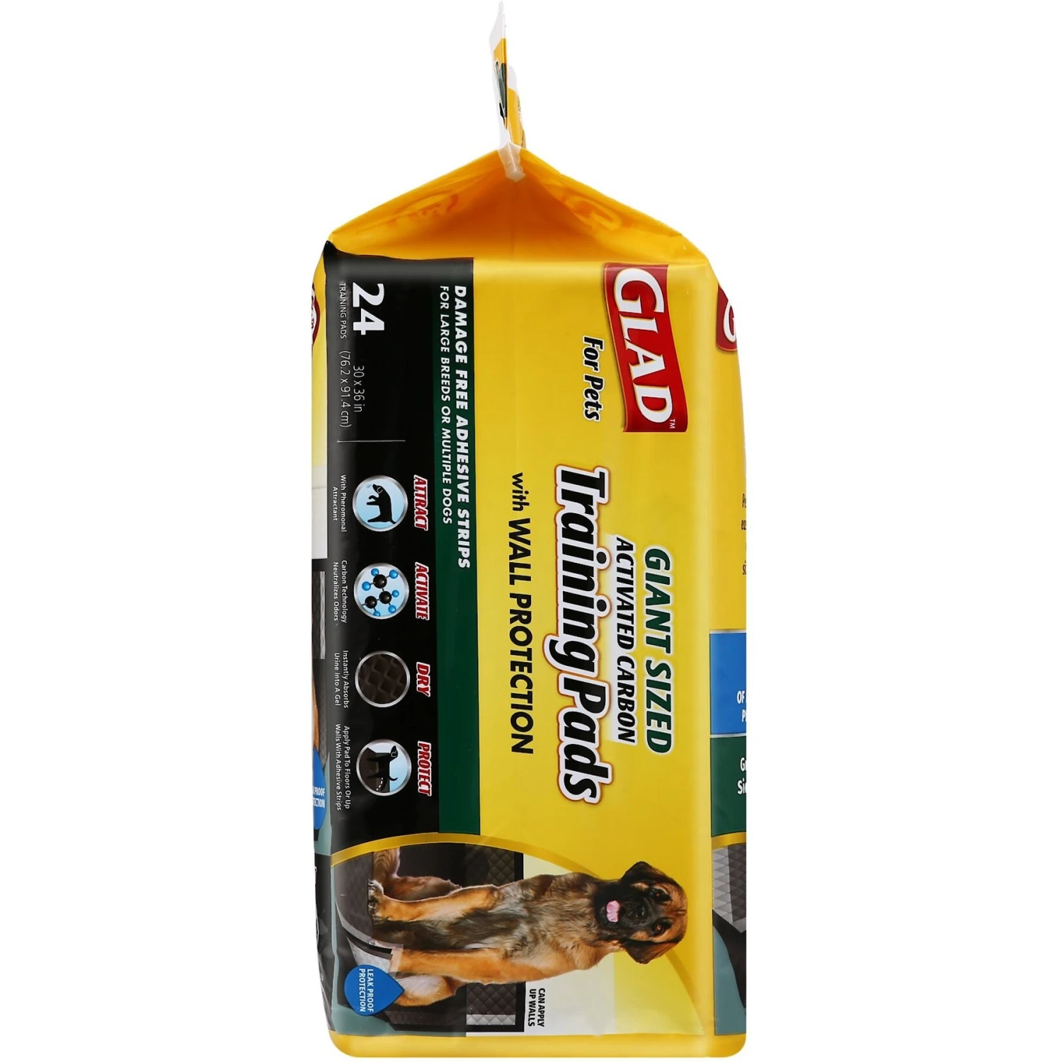 Give your dog a leg up on potty training with Glad Activated Carbon Giant Sized Dog Training Pads. These fast-acting and effective training pads help train your pup and keep messes at bay. They cover a large surface area, making them ideal for large breed dogs or homes with multiple pups. Adhesive strips help secure half of the pad onto the wall, which comes in handy if your male pup needs more practice with his aim. Activated carbon helps neutralize unpleasant smells, and urine is quickly absorbed and turned into a gel for leak-proof protection. It even features pheromones to help train your pup where to go. This potty technology is designed to make training easier—for both you and your pal!