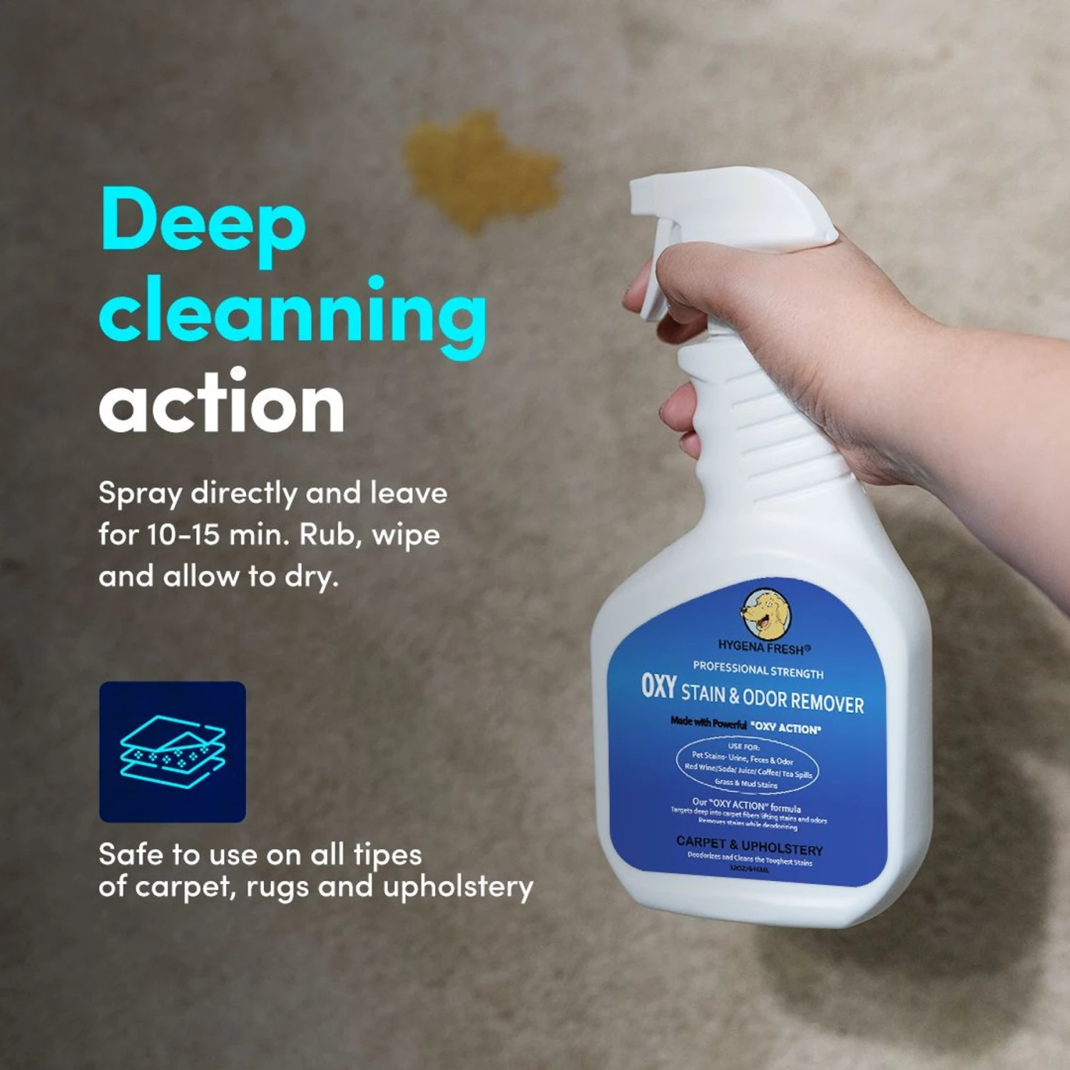 Say bye-bye to stinky pet odors and stains with the Hygena Scoop Fresh Carpet & Upholstery Cleaner Stain Odor Spot Remover Dog, Cat, Horse & Small Pet Deodorizer. This formula uses deep action enzymes to target any pet odors in your home, kennel, laundry and more. It targets deep into fibers to lift stains away in even the toughest scenarios. Just spray the area and the surface will be disinfected and cleaned in 10 minutes. You just have to wipe away the stain. This professional strength formula can even tackle su-paw tough stains like permanent marker and red wine. It’s paw-fect for pet parents who need to clean up urine and poop.