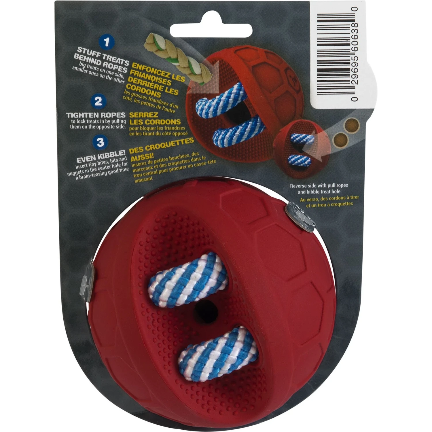 Turn treat time up a level with the JW Fits All Treat Ball Dog Toy! This puzzle toy provides your canine companion with mentally enriching playtime when you stuff your pal’s favorite treats or kibble within its rope nooks and crannies. Simply wedge the tasty morsel behind the ropes, tighten it and watch your inquisitive pal work to get a treat! This treat ball staves off boredom by providing your pooch with vital mental and physical enrichment Additionally, as he works for the treat, the rubber nubs and hexagonal surface texture help clean your pal’s teeth and gums, which can improve his overall dental health and the smell of his breath. It can accommodate a variety of treats in many shapes and sizes.