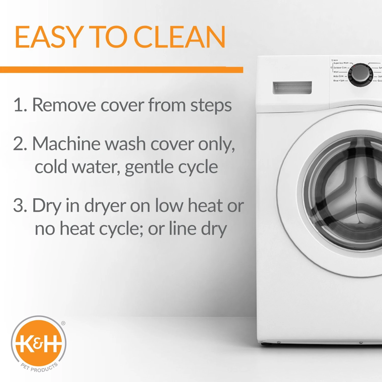 Use to help pets gain access to high beds and couches. Indoor household use only. Place these pet stairs out of path of foot traffic. ; Remove the cover. Machine wash cover only, separately. Mild detergents, no bleach. Cold water, gentle cycle. Air or line dry, or tumble dry on lowest setting. Dry completely before reassembly.