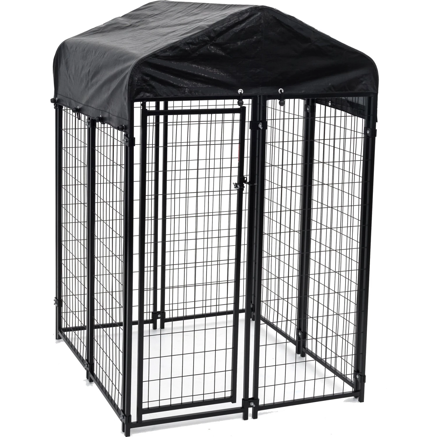 Give your outdoor-lovin’ doggo a paw-some place to call his own with the Lucky Dog Uptown Welded Wire Dog Kennel, Cover & Frame. Built using sturdy wire construction that’s powder-coated to be rust-resistant, this kennel is made for long-lasting durability. It’s designed using modular panels that clamp together easily and raised legs that sit 1.5 inches off the ground to prevent debris from building up. The steel roof is covered with a waterproof tarp that is UV-protected and crafted to resist fading, ripping or cracking while it shelters your doggo from the weather. It features a dog-safe lockable gate latch to keep escape artist puppers inside and provide you with peace of mind.