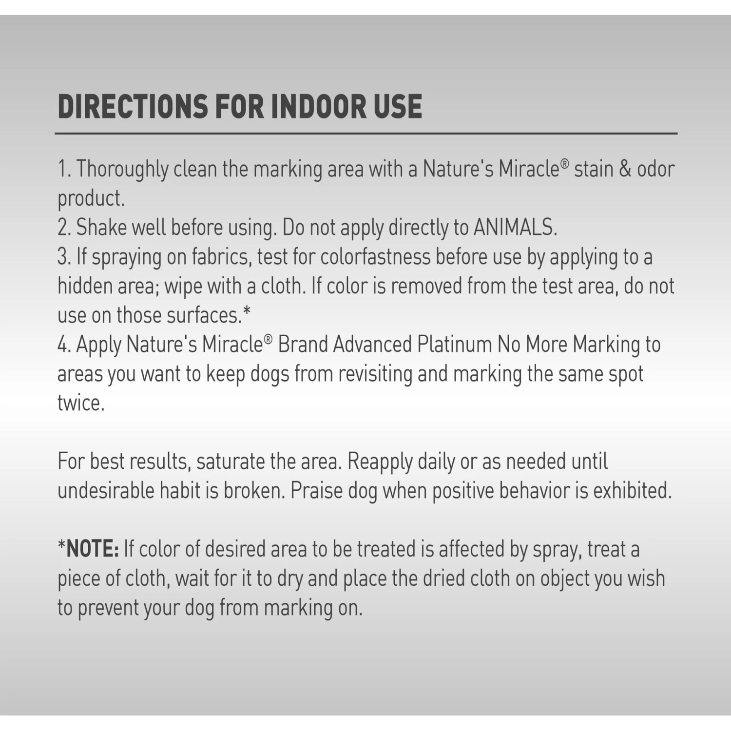 Stain Removal: Wipe away any excess stain-causing material, then soak the surface thoroughly with Nature’s Miracle No More Marking Stain and Odor Remover. Wait 5 minutes, then wipe away stain with a cloth. For tough stains, use a stiff, bristle brush. If the stain is not completely removed, re-soak area and allow to work for 1 hour before wiping with a cloth.