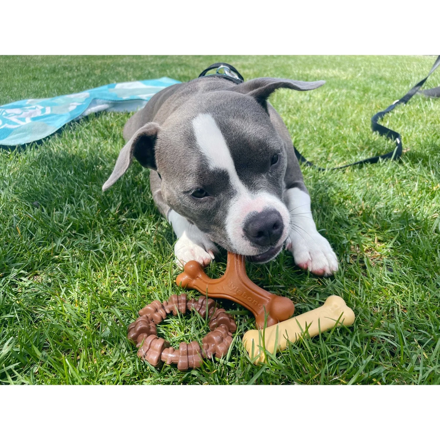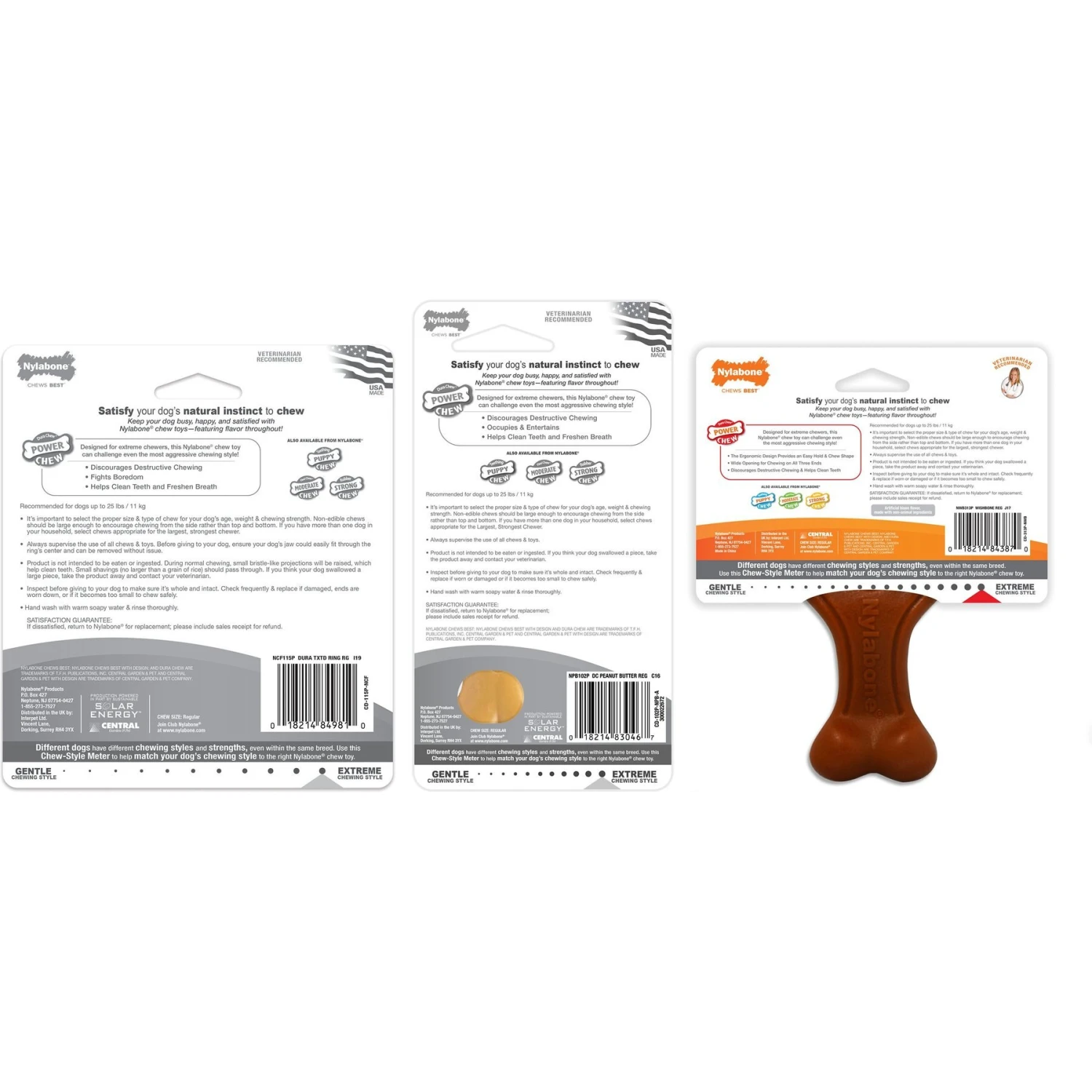 With Nylabone Power Chew Customer Favorites Dog Chew Toy Bundle, triple the chewing options means triple the fun! Including three popular chew toys made of durable nylon, each toy is long lasting and tough enough to stand up to the most aggressive chewers. The large power chew textured ring contains savory bacon flavor dogs love and features a unique circular shape to keep dogs engaged. Speaking of amusing shapes, the dynamic power chew Wishbone for large dogs includes an ergonomic hold-and-chew design with three chewing ends to entertain your furry friend. This textured chew toy also helps clean teeth and freshen breath, giving you both something to smile about. An extra-large power chew peanut butter bone features nubs and ridges that support dog dental health through natural chewing action. Plus, your dog will love its allergen-free peanut butter flavor. All three dog chew bones discourage destructive chewing for a happier, healthier experience. Paw-fect for helping canine companions cope with separation anxiety, fight boredom, or simply satisfying his natural urge to chew.