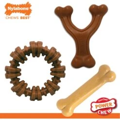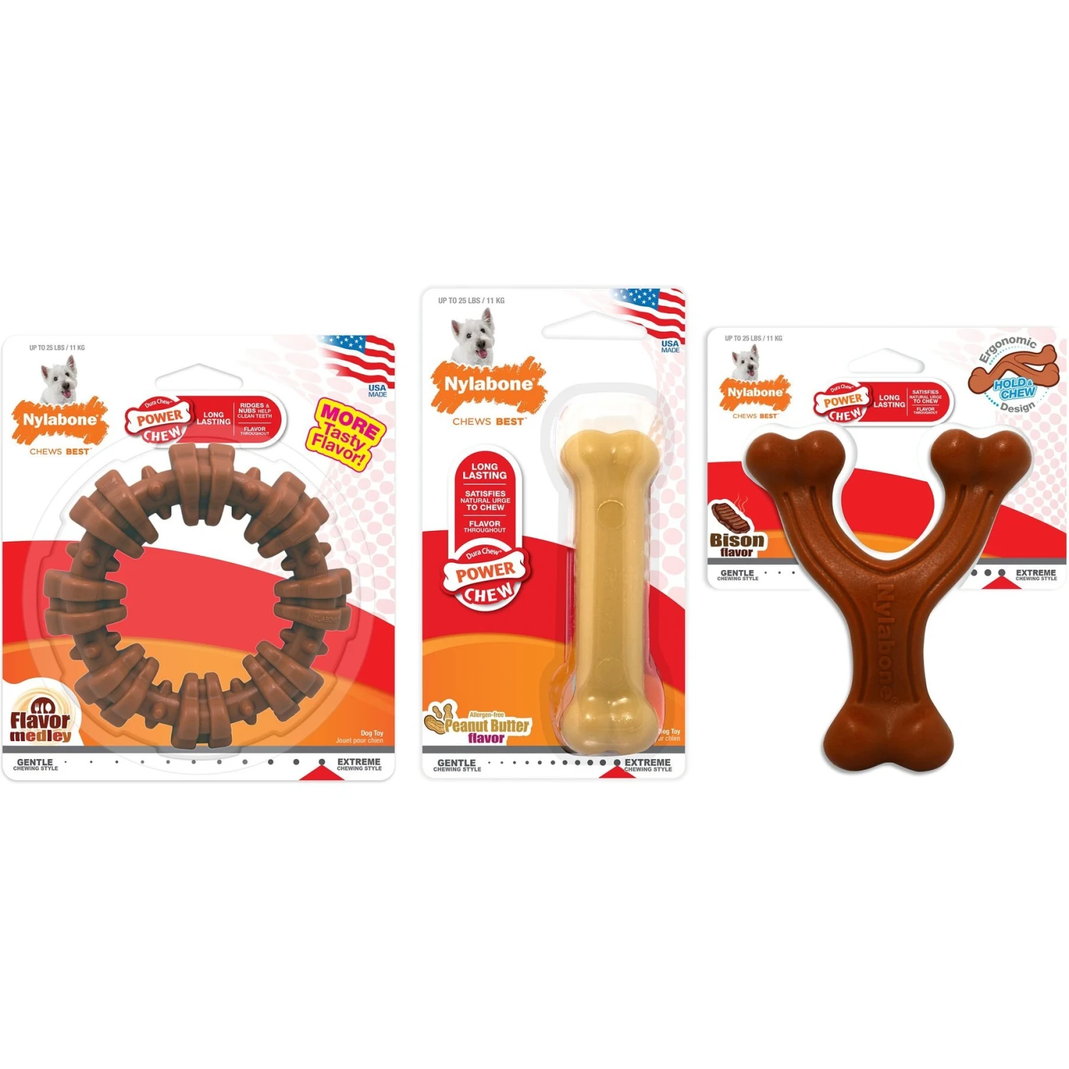 - Dog toy bundle includes three of Nylabone’s most popular power chew toys.