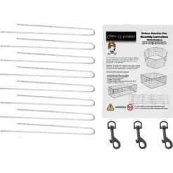 - Includes eight ground stakes for outdoor use and three locking hooks to connect the two ends of the fencing.