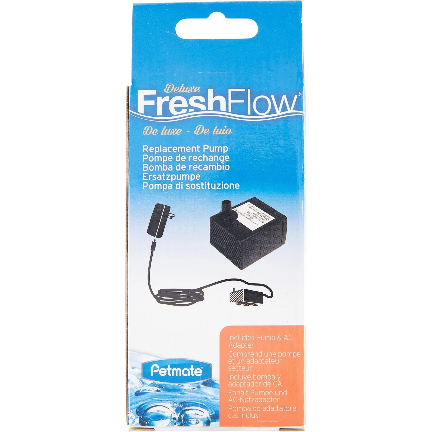 The Petmate Fresh Flow Replacement Pump is compatible with all Fresh Flow fountain models. Includes pump and AC adapter. Please note: It does not include flow lever or on/off switch. Fits all Regular and Deluxe Fresh Flow models. Adapter and cord are included.