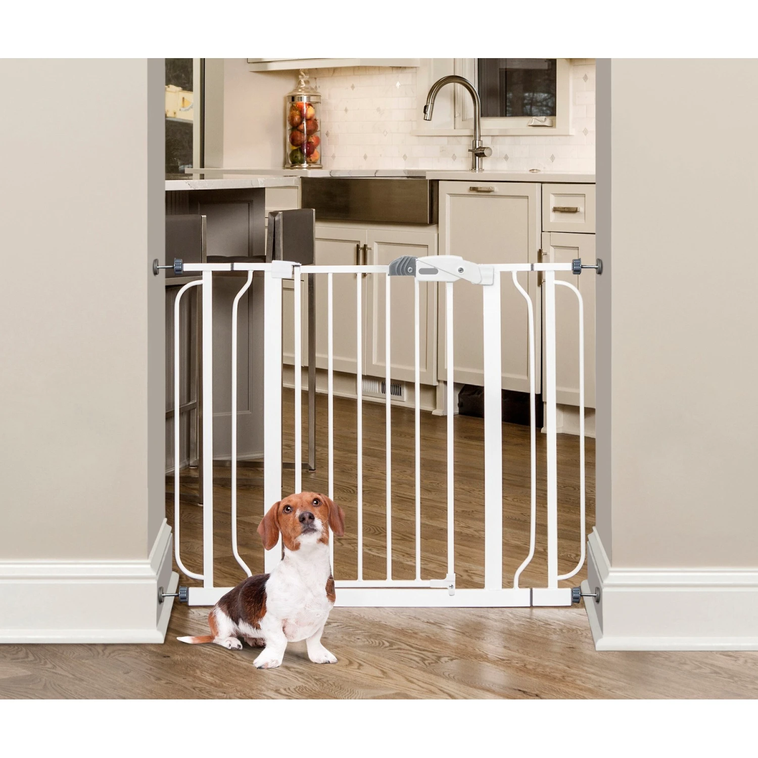 Keep your furry friend safe and sound with the Regalo Easy Step Extra Wide Walk-Through Gate. Made with all-steel construction, it measures 30 inches in height and expands to fit openings between 29 and 41.5 inches with two included 4-inch extensions. This gate pressure mounts for easy installation and comes with hardware to mount to your wall for more stability. It also features a convenient walk-through design with a one-touch release safety lock so you can get by but your paw-tner cannot. Ideal for medium to large dogs, Regalo Easy Step Extra Wide Walk-Through Gate will keep your companion contained.