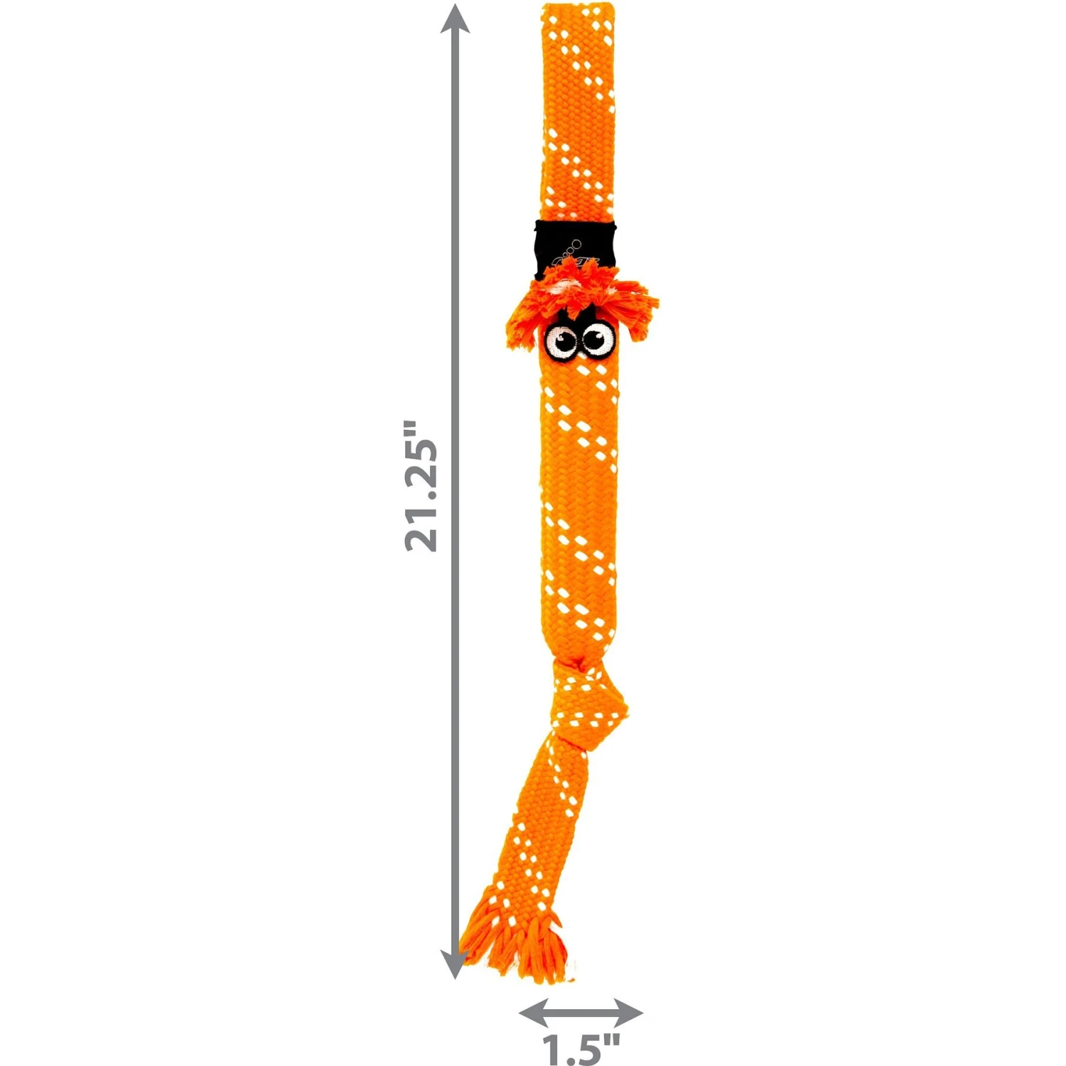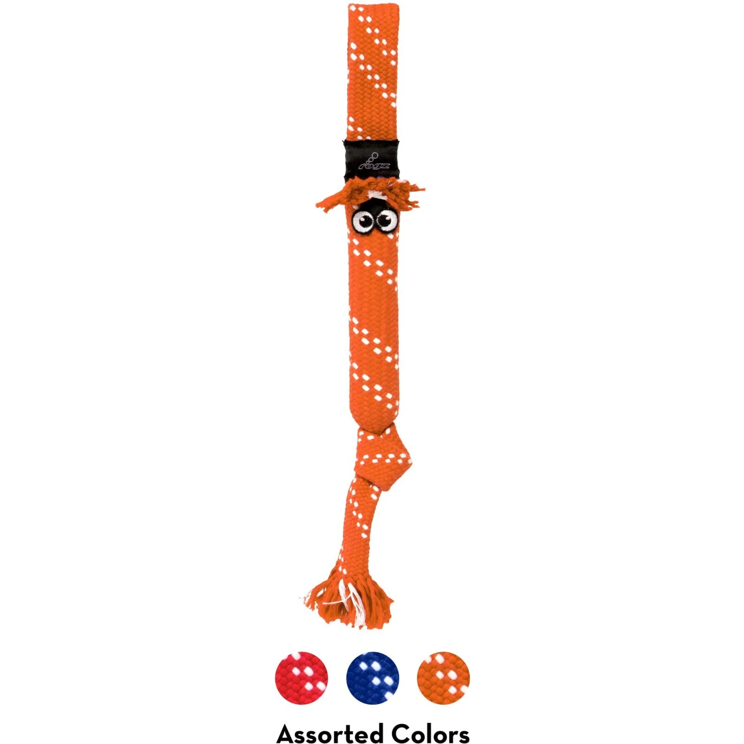 Play time with your pup just got a whole lot more fun with the ROGZ by KONG Scrubz Dog Toy. Made from thick, woven, cotton-polyester blended rope, this toy emits a fun “crackle” sound that entices and entertains your dog. A sturdy loop handle allows you to hold on firmly for a game of tug and gives you that extra fling while playing fetch. Chewing on the durable rope helps keep your best friend’s teeth clean and healthy by removing plaque and tartar buildup; the playful fringe and large knot allow for even more fun chewing variety.