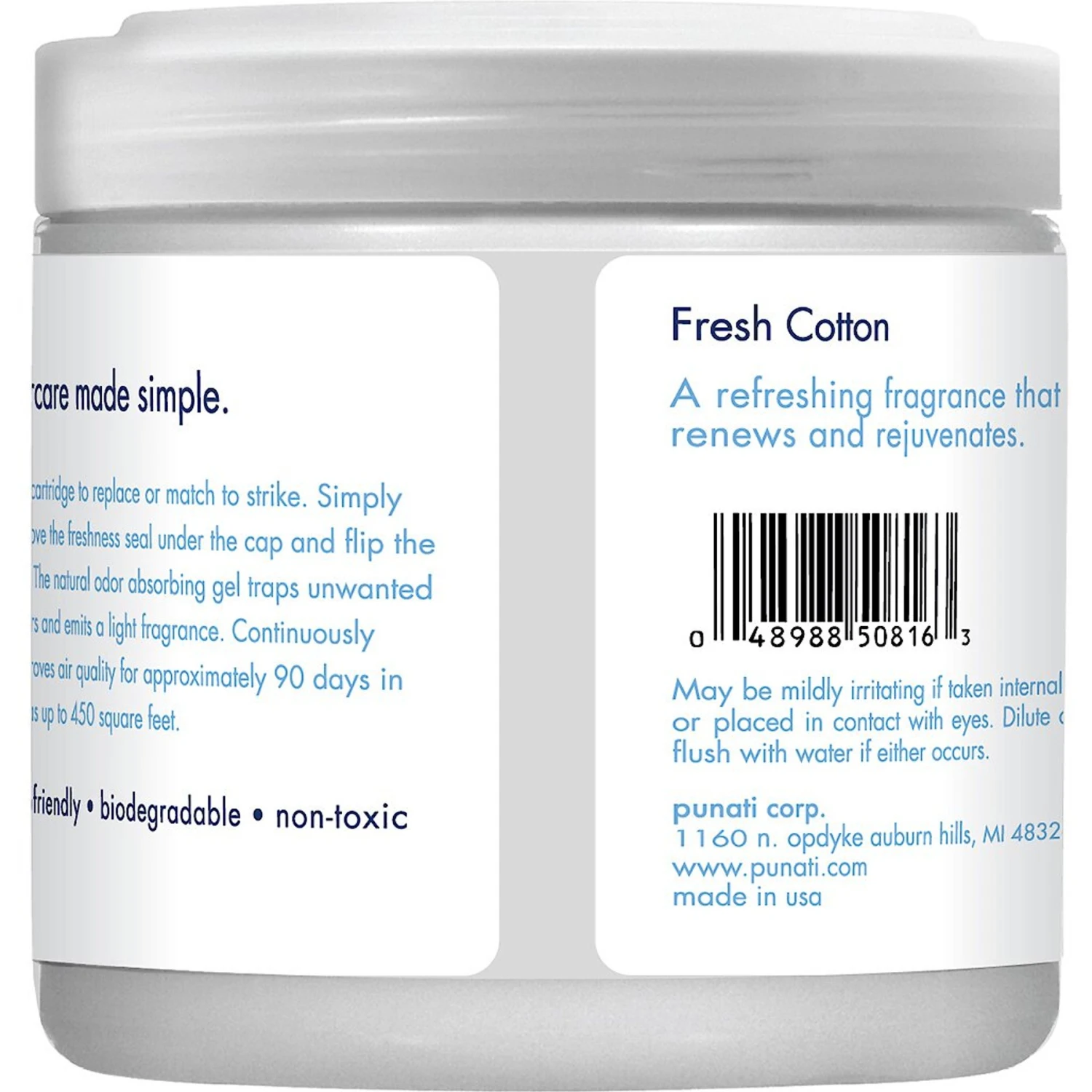 Simply remove the freshness seal under the cap and flip the lid. The natural odor absorbing gel traps unwanted odors and emits a light fragrance. Continuously improves air quality for approximately 90 days in areas up to 450 square feet.