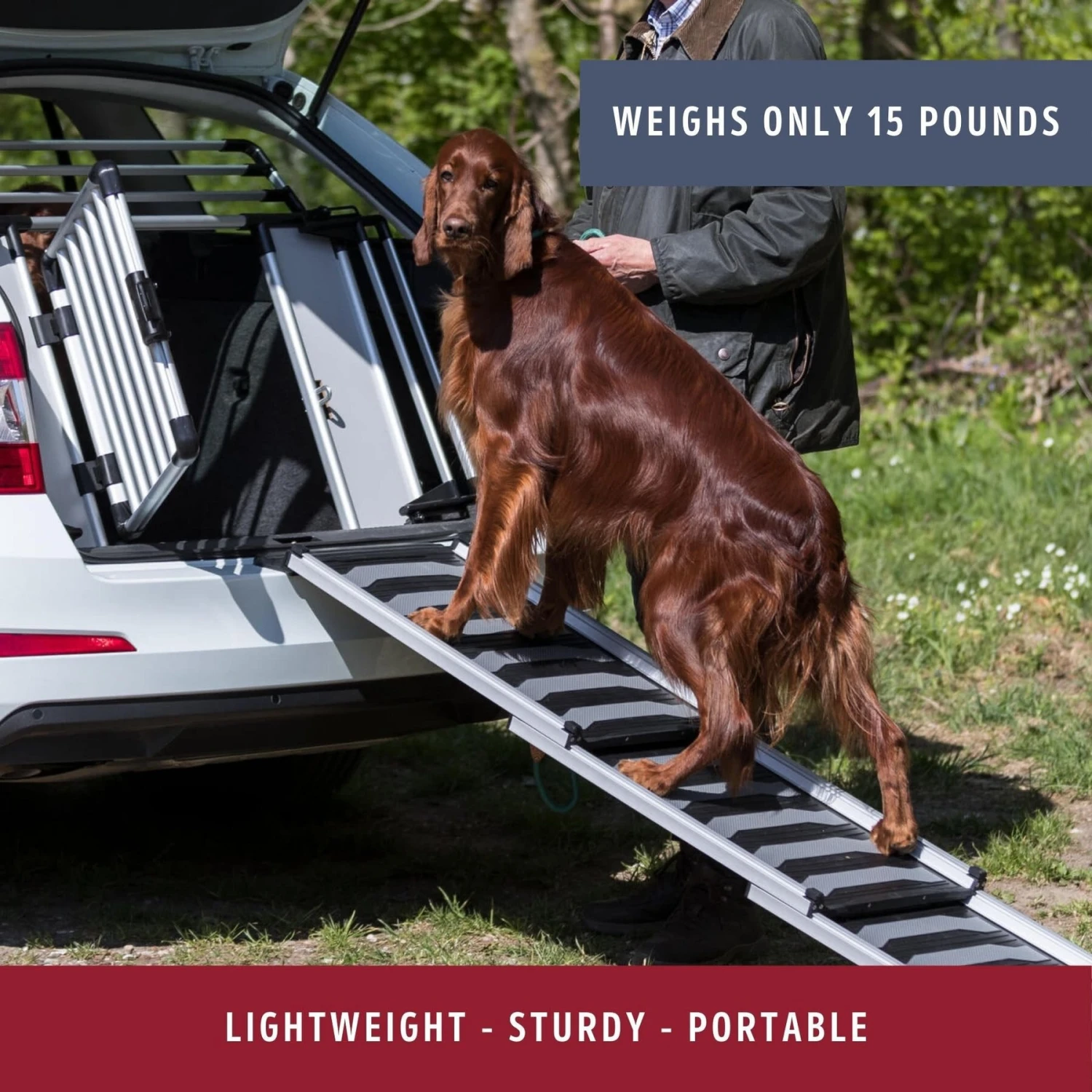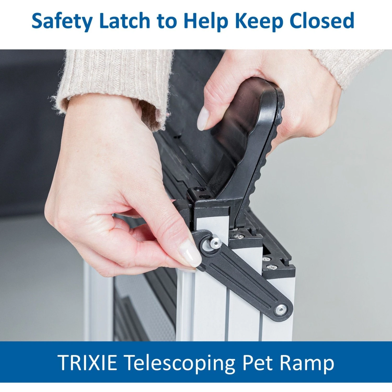 Help your pooch reach new heights with the Heavy Duty Telescoping Dog Ramp from TRIXIE! This state-of-the-art dog ramp is constructed with sturdy aluminum, allowing it to support canines up to 198 pounds. Its length is adjustable from 30 inches to 69 inches, helping your furry friend get in and out of a variety of vehicles. Plus, it only weighs 15 pounds and quickly telescopes down into a smaller size for easier storage.